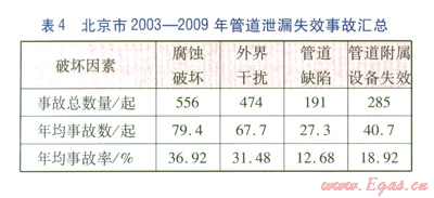 由表l可知,引起北京城市燃?xì)夤艿佬孤┑脑蛑校艿栏g和外界干擾引起的管道事故所占比例較高,兩者之和超過事故總數(shù)的68%,即管道腐蝕和外界干擾是管道失效的主要原因。此外,從2003年至2009年,外界干擾引起管道失效的比例有明顯下降,而管道附屬設(shè)備失效引起的事故比例有所上升,說明近年來燃?xì)夤艿榔髽I(yè)對于管道的管理力度有所加大,社會及施工單位對燃?xì)夤艿赖陌踩庾R有所加強(qiáng)。而燃?xì)夤艿栏綄僭O(shè)備由于種類多、數(shù)量大、分布散等特點(diǎn),檢測相對復(fù)雜,因此容易被管道巡線檢查所忽視,其逐年升高的泄漏失效率應(yīng)在風(fēng)險(xiǎn)評價(jià)中引起足夠的重視。