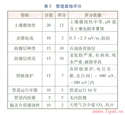 以北京市某段燃?xì)廨斉涔艿罏槔?,結(jié)合凋查資料以及實(shí)際情況,對該段管道的腐蝕破壞等級進(jìn)行風(fēng)險(xiǎn)評估。該段管道腐蝕評分見表5。
