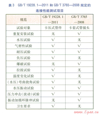 在表3所示的測(cè)試項(xiàng)目中,溫度變化試驗(yàn)及衛(wèi)生要求是針對(duì)自來(lái)水應(yīng)用的。振動(dòng)加循環(huán)脈沖試驗(yàn)是水壓振動(dòng)試驗(yàn)和壓力沖擊(波動(dòng))試驗(yàn)的組合。考慮到全圓弧螺紋連接的薄壁不銹鋼管在水和天然氣兩種場(chǎng)合應(yīng)用,全圓弧螺紋接口連接性能測(cè)試項(xiàng)目應(yīng)涵蓋表3中卡壓式管件的所有測(cè)試試驗(yàn),性能要求也可與卡壓式管件看齊。同時(shí)與卡壓式管件不同,全圓弧螺紋接口連接是螺紋連接,因此應(yīng)該再選取表3中卡套式管接頭的重復(fù)安裝試驗(yàn)和爆破試驗(yàn),性能要求應(yīng)與卡套式管接頭相同。GB/T3765-2008規(guī)定振動(dòng)加循環(huán)脈沖試驗(yàn)可以替代單獨(dú)的水壓振動(dòng)試驗(yàn)和壓力沖擊(波動(dòng))試驗(yàn),全圓弧螺紋接口性能測(cè)試也可作此要求。全圓弧螺紋接口管件如果能夠達(dá)到上述的連接性能要求,則可保證在自來(lái)水和燃?xì)庑袠I(yè)應(yīng)用中的安全性。