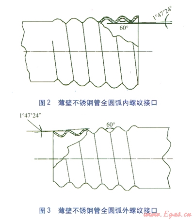 全圓弧螺紋連接是專(zhuān)用于薄壁不銹鋼管的連接技術(shù),采用這種連接的管件的管端具有圓錐度為1:16的全圓弧螺紋接口,亦稱(chēng)錐螺紋接口。其特征是:內(nèi)外螺紋接口均具有1:16的圓錐度,螺紋的牙型角為60°,螺紋的牙頂和螺紋槽底都具相同半徑并相切的圓弧。全圓弧螺紋接口牙型見(jiàn)圖l,內(nèi)螺紋接口和外螺紋接口分別見(jiàn)圖2、3。管件分為直管、管堵、直通(含異徑直通)、三通(含異徑三通)、彎頭(含45°彎頭)、英制外螺紋轉(zhuǎn)換接頭、英制內(nèi)螺紋轉(zhuǎn)換接頭等。