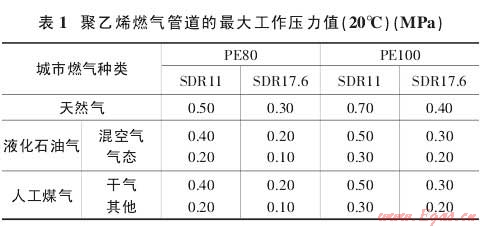1.2.2 在聚乙烯燃?xì)夤艿赖膲毫υO(shè)計中,還需要考慮到燃?xì)庵兴姆枷銦N類物質(zhì)所產(chǎn)生的影響,以及管道的施工條件等因素,根據(jù)國家相關(guān)的行業(yè)標(biāo)準(zhǔn),聚乙烯燃?xì)夤艿涝试S的最大工作壓力如表1。