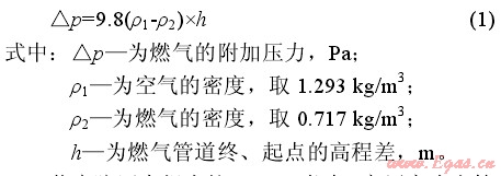 民用天然氣燃具的額定壓力pn=2000Pa,燃具前壓力應在(0.75~1.5)pn范圍內波動(參見《城鎮(zhèn)燃氣設計規(guī)范》(GB50028—2006))。當天然氣壓力超出此范圍,燃具的熱效率降低,燃燒不穩(wěn)定,燃燒噪聲大,出現脫火或者回火等現象。目前,安陽市高層建筑的燃氣設計主要采用低壓入戶,在計算低壓燃氣管道的壓力損失時,應考慮因建筑高度而引起的燃氣附加壓力△p,計算如下: