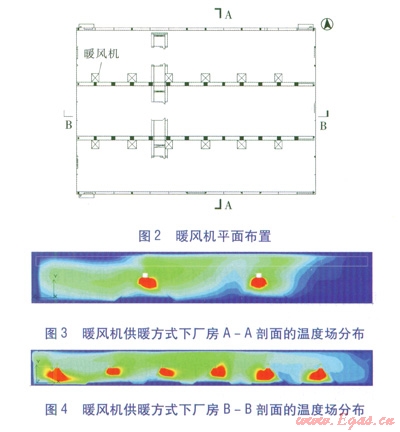 采用安裝在廠房高空的暖風(fēng)機,將熱風(fēng)送至工區(qū),改善工作區(qū)的熱環(huán)境。暖風(fēng)機的安裝高度范圍為4~30 m,單機額定供熱量范圍為20~120 kW.單機輻射面積范圍為500~1