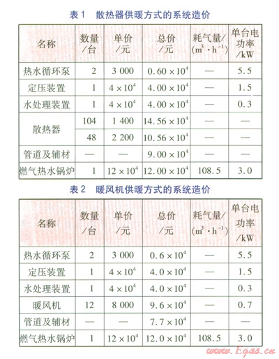 系統(tǒng)造價主要包括設(shè)備費、材料費、各項增容費,由于廠區(qū)內(nèi)已具備各類條件,故不考慮增容費。3種供暖方式的系統(tǒng)造價分別見表l~3。散熱器供暖方式的系統(tǒng)造價為54.72×104元,暖風(fēng)機供暖方式的系統(tǒng)造價為37.9×104元,燃氣紅外線輻射供暖方式的系統(tǒng)造價為34×104元。