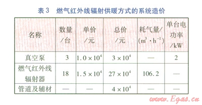 ②在3種高大廠房供暖方式中,燃氣紅外線輻射供暖方式的系統(tǒng)造價及供暖期運行費最低。