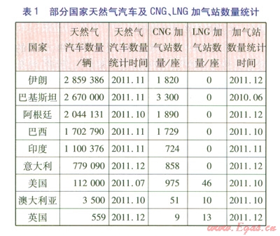 由表l可以看出,伊朗、巴基斯坦、阿根廷、巴西、印度和意大利等幾個(gè)國家的天然氣汽車擁有量接近世界天然氣汽車總量的80%,且全部采用CNG汽車。通過表l中CNG加氣站與LNG加氣站數(shù)量對(duì)比,可以判斷,世界范圍內(nèi)LNG汽車數(shù)量遠(yuǎn)遠(yuǎn)小于CNG汽車數(shù)量,車用LNG處于起步階段。