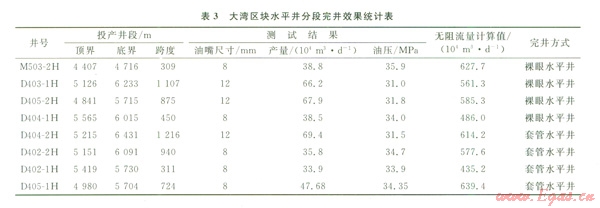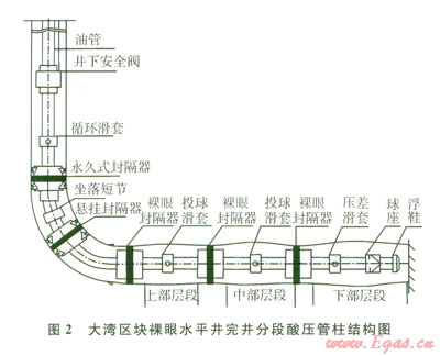 研究結(jié)果表明,氣井產(chǎn)能隨分段數(shù)目的增加而增加,但增產(chǎn)幅度隨之減小,當(dāng)分段數(shù)目達到一定數(shù)量時,增加分段數(shù)的效果已不明顯。根據(jù)單井實鉆資料及測井解釋結(jié)果,綜合考慮水平井段儲層、夾層、裂縫發(fā)育情況及封隔條件,結(jié)合儲層改造能力和酸壓模擬結(jié)果,并考慮投產(chǎn)作業(yè)施工的安全性和經(jīng)濟性,大灣區(qū)塊水平井段分2~3段完井。對投產(chǎn)井段長度約l 000 m的氣井,分段數(shù)設(shè)計為3段,投產(chǎn)井段長度約600 m的氣井,分段數(shù)設(shè)計為2段。