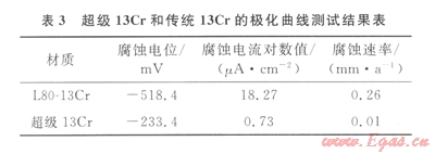 極化曲線測(cè)試結(jié)果如圖l、表3所示。可以看出,超級(jí)l3Cr的腐蝕電位較傳統(tǒng)的L80-13Cr顯著正移,其腐蝕速率更是遠(yuǎn)小于L80-13Cr的腐蝕速率,僅為0.01 mm/a。