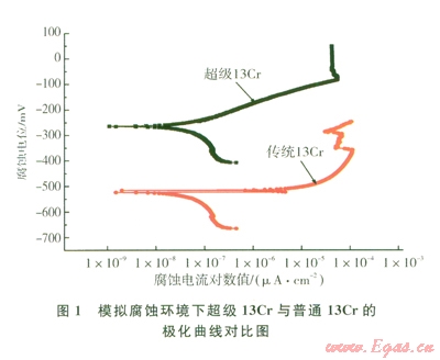 采用Princeton-M370電化學(xué)測(cè)試系統(tǒng)對(duì)超級(jí)13C和傳統(tǒng)L80-13Cr試樣進(jìn)行極化曲線測(cè)試,測(cè)試范圍:相對(duì)于自腐蝕電位的-l50~+350 mV,掃描速率0.166 mV/s,電化學(xué)試樣規(guī)格為øl4 mm×
