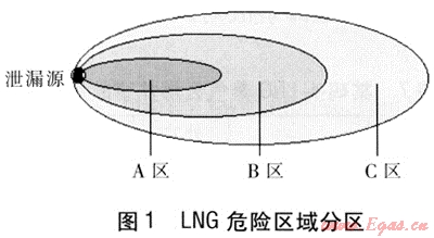 LNG蒸發(fā)達到一定濃度時,可能危及人的生命安全,遇到明火,甚至會產(chǎn)生爆炸。本評價根據(jù)LNG蒸氣擴散到不同濃度時造成危害程度的大小,將LNG擴散的危險區(qū)域劃分為3個區(qū)。爆炸危險區(qū)(A區(qū)):LNG蒸氣濃度高于爆炸下限,遇明火產(chǎn)生爆炸;嚴重損害區(qū)(B區(qū)):LNG蒸氣濃度較高,可能造成人員急性中毒甚至死亡;輕度損害區(qū)(C區(qū)):LNG蒸氣濃度可引起人員不良反應,造成輕度中毒或吸入反應。3個區(qū)域的關系見圖1。