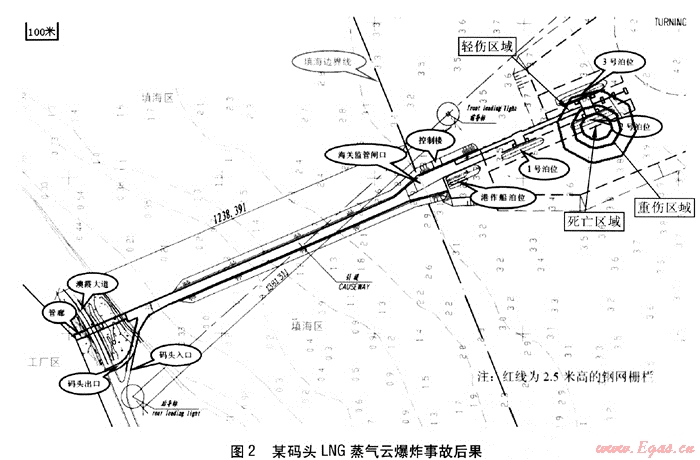 ② 從發(fā)生蒸氣云爆炸后果看,人員死亡、重傷半徑、輕傷半徑分別為40m、69m、117m;暴露在戶外的碼頭作業(yè)人員及船員將遭受重傷以上的傷害,停泊在碼頭的船舶及LNG管道、裝卸臂等設備設施將遭受嚴重破壞。