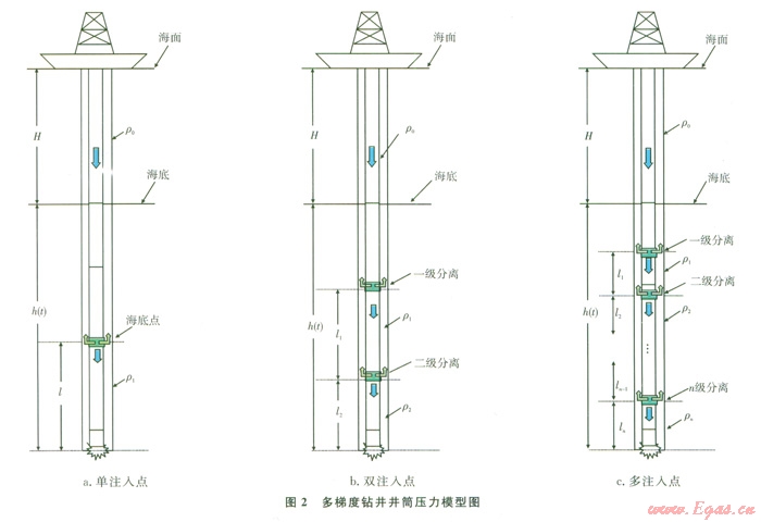 隨著陸上和淺海油氣資源的持續(xù)不斷開發(fā),勘探開發(fā)轉(zhuǎn)向海洋尤其轉(zhuǎn)向深水已成為必然。但與陸地和淺海鉆井相比,深水海域特殊的自然環(huán)境和復雜的油氣儲藏條件產(chǎn)生了常規(guī)鉆井裝備和工藝難以克服的技術(shù)難題[1]:采用錨泊定位鉆機本身必須承受笨重的錨泊系統(tǒng)的重量,給鉆機定位增加了難度;隔水管除了承受自身重量,還需要承受諸如海流及惡劣的海洋環(huán)境載荷;在海底泥線處的高壓和低溫環(huán)境對鉆井液性能影響;海底的不穩(wěn)定性、淺層水流動、天然氣水合物控制對鉆井的風險;對于常規(guī)鉆井工藝,尤其難于控制井筒鉆井液循環(huán)當量密度在允許的作業(yè)壓力窗口之間。針對井筒壓力控制難度較大的問題,國外20世紀90年代提出和發(fā)展的雙梯度鉆井技術(shù)[2]。目前已實施5個聯(lián)合工業(yè)項目,并取得了階段性成果[3],提出了多套技術(shù)方案,包括海底泵舉升鉆井液、隔水管氣舉、隔水管稀釋以及注空心玻璃球(Hollow Glass Spheres,簡稱空心球)等,以實現(xiàn)井筒壓力的優(yōu)化控制。本文基于雙梯度鉆井技術(shù),提出了多梯度鉆井技術(shù),該技術(shù)比雙梯度鉆井能更好地匹配地層壓力,使井底壓力在較長的距離內(nèi)介于地層壓力和破裂壓力之間,能夠簡化深水復雜井身結(jié)構(gòu),有效控制井筒環(huán)空壓力,實現(xiàn)安全鉆進,同時提高鉆進效率。