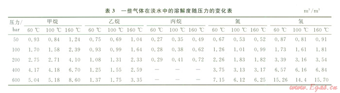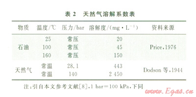 微石油[可溶有機質(zhì)(瀝青)、液態(tài)碳?xì)浠衔锏?span lang="EN-US">]、水在有機質(zhì)成烴演化進程中,既是有機質(zhì)的成烴產(chǎn)物,又是天然氣的溶解載體;水既參與演變,又充當(dāng)微石油、溶解天然氣的載體。其溶解量則與溫度、壓力等外在因素相關(guān)(表2、3)。