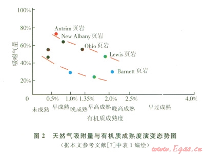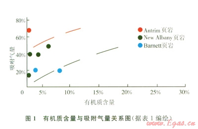 據(jù)本文參考文獻[7-8],從表l資料編繪的圖l中可以看出,頁巖氣的吸附量與其有機質(zhì)豐度呈正相關(guān)態(tài)勢,即有機質(zhì)含量增高其吸附氣量亦增加。
