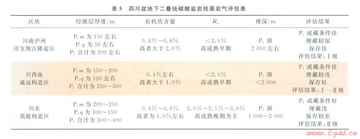 基于對碳酸鹽巖烴源巖氣與頁巖氣成藏機制類同的認(rèn)識,在現(xiàn)今頁巖氣評估標(biāo)準(zhǔn)尚無定論的實際情況下,僅以碳酸鹽巖烴源巖展布、有機質(zhì)豐度、有機質(zhì)成熟度、埋深、圈閉等諸因素綜合分析得出以下評估結(jié)果:以川南瀘州印支期古隆起為最有利區(qū),P1碳酸鹽巖烴源巖厚度較大,有機質(zhì)豐度較高,成熟度適中,埋藏較深,圈閉保藏佳,評為最有利區(qū)(Ι級);川西南威遠(yuǎn)構(gòu)造區(qū)為有利區(qū)(Ι-Ⅱ級);川東高陡構(gòu)造區(qū)為較有利區(qū),P1碳酸鹽巖烴源巖厚度大,但成熟度較高及埋藏較淺,其烴氣保存條件不如瀘州印支期古隆起區(qū),故列為Ⅱ級(表5)。