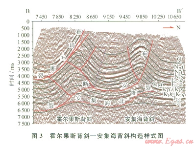 南緣沖斷帶霍、瑪、吐構(gòu)造深層發(fā)育三角楔構(gòu)造。圖3為過霍爾果斯與安集海背斜的一條區(qū)域剖面?;魻柟贡承鄙畈康臉?gòu)造三角楔由霍安斷裂與一個反向沖斷層組成。沿中下侏羅統(tǒng)發(fā)育的滑脫斷層向上突破白堊系,再沿白堊系滑脫,前鋒向上突破控制了北部安集海背斜中淺層背斜特征?;舭矓嗔言诨魻柟贡承毕蛏贤黄瓢讏紫档倪^程中(前沖斷層),同時伴生一個反向的沖斷層(反沖斷層),形成霍爾果斯背斜深部構(gòu)造三角楔。可以看出構(gòu)造三角楔前端向斜軸面位置與三角楔前緣端點位置一致,符合構(gòu)造三角楔幾何變形原理。