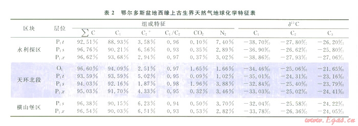 研究區(qū)氣藏除了來自本區(qū)山西組-羊虎溝組太原組煤系烴源巖的自生自儲型氣源外,也有可能接受東側(cè)天環(huán)向斜早期的側(cè)向供烴。天環(huán)向斜北部二疊系下部(山西組、太原組)和石炭系羊虎溝組有效烴源巖的目前的成熟度為I.35%~2.0%,區(qū)域資料證實其在西緣構(gòu)造定型之前與西緣的源巖演化較為一致,西緣構(gòu)造隆升除了可以接受本區(qū)下部烴源巖的垂向供烴外,也可以接受天環(huán)向斜的側(cè)向供烴。另外,研究區(qū)天然氣組分特征及輕烴同位素特征與天環(huán)北段有一定的相似性(表2),表明其有可能是同源的天然氣,因而不能排除天環(huán)向斜為其來源之一。