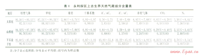 1)永利探區(qū)上古生界氣藏天然氣組分以烴類氣體為主,甲烷為烴類氣體的主要組分,其含量多超過90%,非烴氣體以氮氣為主,極少量為二氧化碳;氣藏的重?zé)N含量不高,干燥系數(shù)較高,氣藏總體上偏干,下石盒子組天然氣曾經(jīng)經(jīng)歷過較明顯的分餾作用。