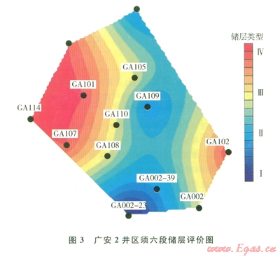 2)廣安2井區(qū)須六段儲(chǔ)層中部南北向?yàn)闅獠馗患瘏^(qū),東、西兩翼儲(chǔ)層為Ⅲ、Ⅳ類儲(chǔ)層。廣安106井區(qū)須四段儲(chǔ)層整體為Ⅲ、Ⅳ類儲(chǔ)層,西北翼和南部?jī)?chǔ)層相對(duì)較好。