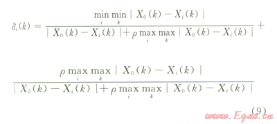 為所有比較序列各個(gè)指標(biāo)絕對(duì)差的最大值;| X0 (k)- Xi(k)|為第i個(gè)序列第k個(gè)指標(biāo)與參考序列絕對(duì)差值。