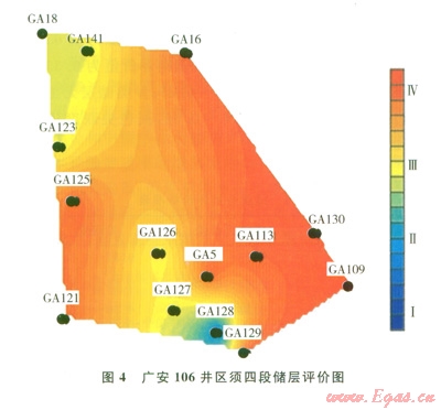 應(yīng)用儲(chǔ)層評(píng)價(jià)方法對(duì)廣安2井區(qū)須六段儲(chǔ)層和廣安106井區(qū)須四段儲(chǔ)層進(jìn)行了分類評(píng)價(jià)(圖3、4)。從圖中可以看出,廣安2井區(qū)須六段儲(chǔ)層中部南北向儲(chǔ)層為Ⅰ、Ⅱ類儲(chǔ)層;向東、西兩翼發(fā)展儲(chǔ)層逐漸變差,為Ⅲ、Ⅳ類儲(chǔ)層。因而,中部南北向?yàn)闅獠馗患瘏^(qū),是氣藏開發(fā)的重點(diǎn)區(qū)域。廣安106井區(qū)須四段儲(chǔ)層整體為Ⅲ、Ⅳ類儲(chǔ)層,西北翼和南部?jī)?chǔ)層相對(duì)較好。