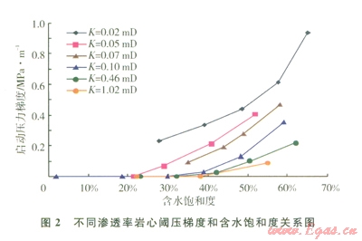 低滲透砂巖含水氣藏巖樣滲流實(shí)驗(yàn)表明,當(dāng)含水飽和度較高時(shí),氣體滲流出現(xiàn)非達(dá)西流現(xiàn)象,存在閾壓梯度[8]。閾壓梯度與巖心滲透率及含水飽和度相關(guān)(圖2),巖心滲透率越低,含水飽和度越高,閾壓梯度越大。閾壓梯度可作為衡量?jī)?chǔ)層流動(dòng)性強(qiáng)弱的指標(biāo),也是影響儲(chǔ)量動(dòng)用程度的重要參數(shù),因此,將閾壓梯度作為低滲含水儲(chǔ)層評(píng)價(jià)參數(shù)是必要的。