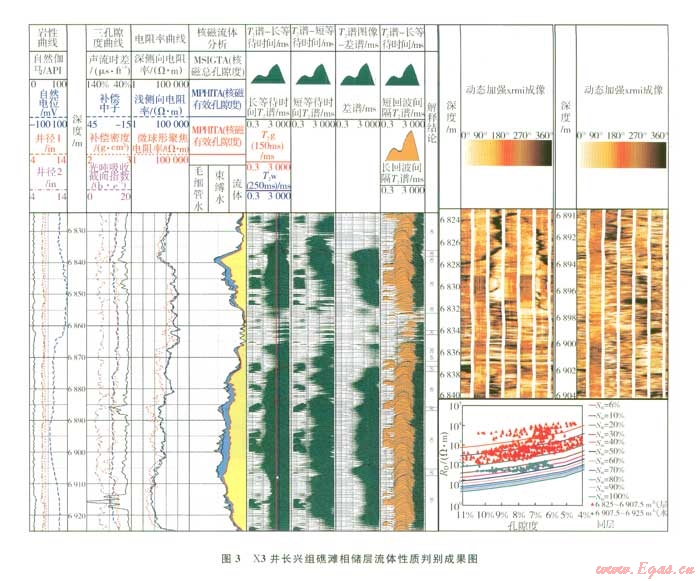 2)不同飽和度下電阻率與孔隙度交會(huì)、核磁共振測(cè)井氣水弛豫分布信息足礁灘相儲(chǔ)層氣水差異判別的最有效的方法。尤其能解決裂縫引起的深淺側(cè)向負(fù)差異的流體性質(zhì)識(shí)別難題。