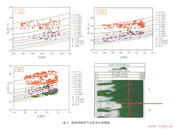 常規(guī)和核磁共振測(cè)井結(jié)合是判別礁灘相儲(chǔ)層流體性質(zhì)的最有效的方法。礁灘相儲(chǔ)層非均質(zhì)性強(qiáng),不同儲(chǔ)層物性對(duì)應(yīng)的孔隙度膠結(jié)指數(shù)、飽和度指數(shù)有所差異,與此對(duì)應(yīng)的氣水差異識(shí)別圖版也有所不同。因此,針對(duì)這些特征,以φ≥10%、φ=5%~l0%、φ=2%~5%作為礁灘相儲(chǔ)層Ⅰ、Ⅱ、Ⅲ類的物性分類標(biāo)準(zhǔn),分別擬合了Ⅰ、Ⅱ、Ⅲ類儲(chǔ)層在不同飽和度下電阻率與孔隙度的氣水識(shí)別圖版(圖2),這些圖版是基于密閉取心分析的不同儲(chǔ)層物性的孔隙度膠結(jié)指數(shù)、飽和度指數(shù)的差異而建立的,其樣本點(diǎn)主要是YB地區(qū)長(zhǎng)興組礁灘相儲(chǔ)層已經(jīng)測(cè)試的電測(cè)數(shù)據(jù)。因此,依據(jù)Ⅰ、Ⅱ、Ⅲ類儲(chǔ)層氣水識(shí)別圖版,能準(zhǔn)確判別出礁灘相儲(chǔ)層的流體性質(zhì)。
