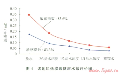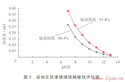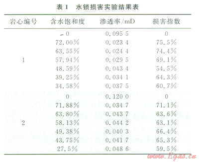 1)儲層巖心具有較強的水鎖、水敏和堿敏損害特征:根據(jù)對該地區(qū)低滲透儲層段含水飽和度的統(tǒng)計,其儲層段含水飽和度平均為64.81%,對照實驗結果,儲層段受到中等偏強水鎖損害(表1)。儲層段巖心水敏性實驗表明,滲透率分別由0.3485mD降至0.0572mD、由0.1750mD降至0.0292mD,巖心的敏感指數(shù)分別為83.6%和83.3%,說明該地區(qū)低滲透儲層段具有強水敏性(圖4)。儲層段巖心堿敏評價實驗結果表明,當pH值由7升至l3時,巖心滲透率分別南0.3762mD降至0.0158mD、由0.2639mD降至0.0095mD,巖心的堿敏感指數(shù)分別為95.8%和96.4%,該地區(qū)低滲透儲層具有強的堿敏性(圖5)。