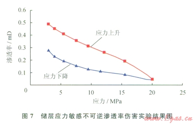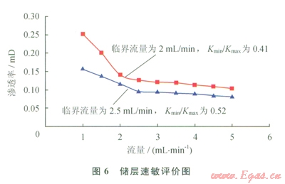 2)中等速敏和壓力敏感損害:儲層巖心液測速敏實驗表明,在1~5mL/min的測定流量范圍內(nèi),巖心的最小滲透率Kmin和最大滲透率Kmax分別為0.1029mD、0.2514mD和0.08mD、0.155mD,臨界流量為2~2.5mL/min,Kmin/Kmax分別為0.41、0.52,液測速敏損害較強(圖6)。儲層巖心應力敏感實驗結果由實驗結果可知:該地區(qū)低滲透儲層的應力敏感性為中等損害,滲透率由0.49mD降低為應力變化后的0.275mD,其應力敏感引起的不可逆滲透率損害率為43.9%(圖7)。