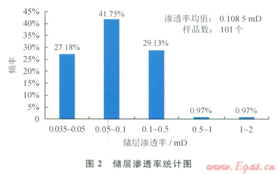 根據(jù)砂巖儲層孔隙度、滲透率與最大孔喉半徑的關系,該區(qū)塊儲層滲透率主要分布在0.035~0.5mD,占98.06%,主要孔喉半徑分布在O.1~0.8mm;儲層最大滲透率范圍在0.5~2mD,其對應的最大孔喉半徑范圍0.8~3.0mm,該儲層對滲透率貢獻率最大的孔喉半徑區(qū)間為0.1~0.8mm和0.8~3.0mm。