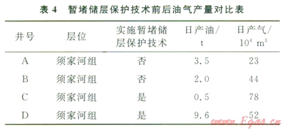 針對研究的四川油氣田某區(qū)塊須家河組儲層,須家河組儲層段中的2口開發(fā)井實施多級架橋暫堵儲層保護技術前后的油氣產(chǎn)量對比(表4)。實施多級架橋暫堵儲層技術的2口開發(fā)井,其油氣產(chǎn)量得到明顯提高,充分說明多級架橋暫堵技術對值層具有良好的保護作用。