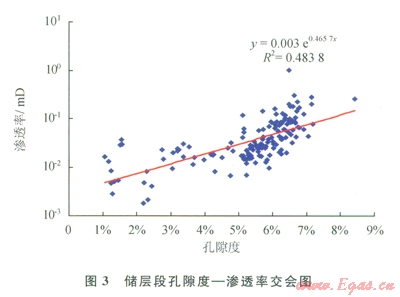 通過對該地區(qū)儲層段巖樣統(tǒng)計分析表明,儲層孔隙度主要集中分布在6%~8%(圖1),平均孔隙度為6.72%;儲層段樣品滲透率主要集中在0.035~0.5mD,占98.06%(圖2),平均滲透率為0.1085mD。儲層孔隙度和滲透率二者存在較好的指數(shù)相關性,R達到0.6988,滲透率隨孔隙度增大而增大(圖3)。因此,該區(qū)儲層屬于低孔、低滲透性儲層。