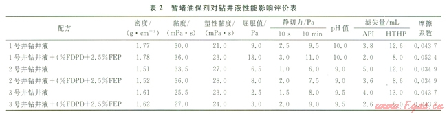 為考察暫堵油保劑加入后鉆井液性能的變化,采用了該地區(qū)現(xiàn)場鉆井液加入4%FDPD多級架橋暫堵粒子和2.5%FEP可變形軟化粒子前后的流變性能對比實驗(表2)。
