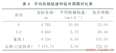 攻克了螺桿等鉆具無法攻克的二疊系極堅(jiān)硬玄武巖,單趟最大進(jìn)尺827m,除l5號井因鉆井液不適應(yīng)地層導(dǎo)致此井段出現(xiàn)5趟起下鉆外,大部分井實(shí)現(xiàn)兩趟從三疊系鉆完第二次開鉆的Æ241.3mm至奧陶系,平均單井節(jié)約時(shí)間達(dá)30.27d,大幅降低鉆井周期、提高了鉆井效率;井深6785m的直井9號同時(shí)應(yīng)用了此兩種提速技術(shù),平均機(jī)械鉆速l0.69m/h,鉆井周期僅55d,提速效果遠(yuǎn)高于鄰井9-2號和其他油田相似深度井[8-12]。(表4)。能夠消除“卡—滑”現(xiàn)象并保持鉆頭對地層連續(xù)切削的TorkBuster配合高抗沖擊的專用PDC鉆頭U513M提速技術(shù)對塔北地區(qū)三疊系—奧陶系地層具有良好的適應(yīng)性。