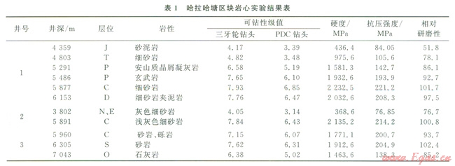 塔北地區(qū)地層自上而下主要為新生界第四系、新近系、古近系,中生界白堊系、侏羅系、三疊系,古生界二疊系、石炭系、泥盆系、志留系、奧陶系,部分區(qū)塊存在層位缺失。實(shí)鉆資料顯示古生界機(jī)械鉆速慢,為提速瓶頸地層。因此以該地區(qū)哈拉哈塘區(qū)塊為例,進(jìn)行了一定數(shù)量的此井段巖心室內(nèi)測試,測試結(jié)果如表1所示。根據(jù)實(shí)鉆資料和巖心室內(nèi)試驗(yàn)結(jié)果,總結(jié)塔北地區(qū)鉆井提速難點(diǎn)如下。