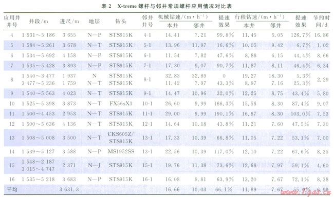 X-treme螺桿(Æ203mm)+PDC鉆頭復(fù)合鉆井技術(shù)在塔北地區(qū)哈拉哈塘、新墾、熱普區(qū)塊13口井第二次開鉆的Æ241.3mm井眼上部井段進(jìn)行了應(yīng)用,應(yīng)用地層為新近系—三疊系、部分井進(jìn)入二疊系頂部,平均單井進(jìn)尺3631.3m,平均機(jī)械鉆速和行程鉆速分別為l6.66m/h和11.89m/h,表2為X-treme螺桿(Æ203mm)與鄰井常規(guī)螺桿應(yīng)用情況對比。