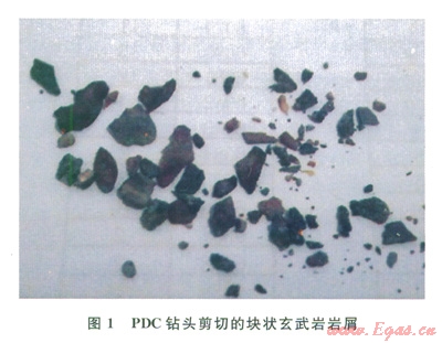 2)二疊系:巖性復(fù)雜,主要為玄武巖、砂巖和泥巖互層。地層硬度大,達(dá)l581.26MPa,可鉆性差,三牙輪可鉆性級值達(dá)7.65,PDC鉆頭可鉆性級值達(dá)6.1;玄武巖致密、性脆、硬度極高,耐磨性強(qiáng),對鉆頭傷害極大,導(dǎo)致跳鉆現(xiàn)象,崩壞PDC鉆頭切削齒;PDC鉆頭失效造成多余的起下鉆,而換成牙輪鉆頭后機(jī)械鉆速極低,多分布于1~2m/h,低至1m/h,導(dǎo)致鉆井周期增大,為該地區(qū)鉆井難度最大的地層。圖l為塊狀玄武巖屑照片。