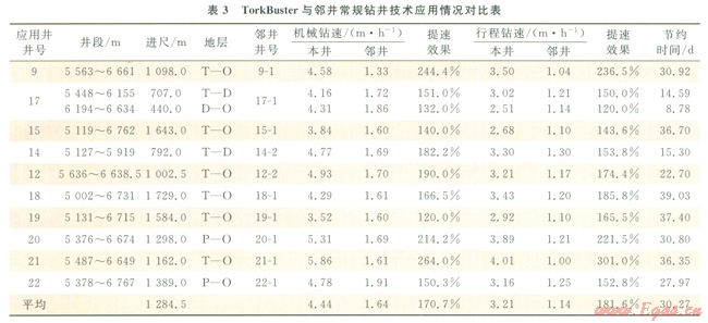 第二階段對鉆頭進(jìn)行優(yōu)化,配合針對塔北地區(qū)設(shè)計(jì)的PDC鉆頭U513M在10口井第二次開鉆的Æ241.3mm下部井段進(jìn)行了應(yīng)用,應(yīng)用地層為三疊系—奧陶系,平均單井進(jìn)尺1284.5m,平均機(jī)械鉆速和行程鉆速分別為4.44m/h和3.2lm/h,與鄰井同井段應(yīng)用常規(guī)鉆井技術(shù)相比,分別提高170.7%和181.6%;表3為TorkBuster與鄰井常規(guī)鉆井技術(shù)應(yīng)用情況對比,TorkBuster+U513M技術(shù)提速效果顯著。