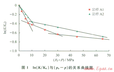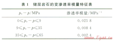 采用擬三軸應力巖心夾持器測定該井取樣巖心在不同有效應力下的滲透率,發(fā)現(xiàn)在儲層壓力范圍為0~65MPa時,表現(xiàn)為變滲透率模量特征,研究發(fā)現(xiàn)可以用3段滲透率模量來表征滲透率隨有效應力變化的關(guān)系(表1)。