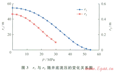 圖3為r1與r2隨井底流壓的變化關(guān)系圖,由于實驗發(fā)現(xiàn)在有效應力的變化范圍內(nèi)存在著3段滲透率模量,因此從井眼半徑r3(或rw)到供給半徑r0(或re)之間存在著r2與r1將氣藏在徑向上分為3個區(qū)域,每個區(qū)域由于有效應力的不同而呈現(xiàn)出不同的滲透率變化規(guī)律,從圖中看到,當井底流壓小于30MPa時,r1與r2隨著井底流壓的增大都會減小,當井底流壓大于30MPa且小于56MPa時,由于地層中有效應力減小,在徑向上則只存在兩個區(qū)域,且分界處r1隨著井底流壓的增大會進一步減小,直到當井底流壓大于56MPa時,則退化為了常滲透率模量的產(chǎn)能模型。