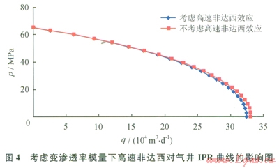 圖4為考慮變滲透率模量下高速非達西對氣井IPR曲線的影響,從圖中可以看到高速非達西效應將會使異常高壓氣藏氣井的產(chǎn)量降低,并且隨著井底流壓的減小,高速非達兩效應使得氣井產(chǎn)量降低得更嚴重。