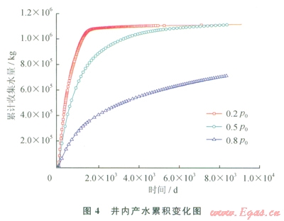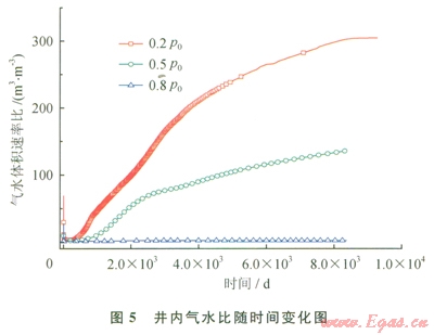 從上述研究成果町以得出,在0.2p0條件下,水合物藏中水合物全部分解,井內(nèi)收集到3.4×105m3的氣體。圖4為0.2p0、42℃,0.5p0、42℃,0.8p0、42℃這3種條件下,井內(nèi)收集水的累積變化圖。從圖4中可以看出,產(chǎn)水集中在開采前期1500d,后期產(chǎn)水速率小。在0.5p0、42℃,0.8p0、42℃條件下,也有較大量的水被收集,表明也有較大量的水合物被分解了。圖5為整個(gè)開采過程中3種條件下,井內(nèi)氣水比隨時(shí)間的變化圖。從圖5可以看出,0.2p0、42℃條件下,氣水比一直在增加,最大值達(dá)到304;而0.5p0、42℃條件下,氣水比增加緩慢,最大達(dá)到136;0.8p0、42℃條件下氣水體積比一直接近0,開采后期也沒有改善。可以看出,在井內(nèi)壓力高時(shí),井和物藏間的壓差不夠大,整個(gè)開采過程,分解后的自由氣并沒有大量流人開采井內(nèi)。可見減壓驅(qū)動(dòng)力對于分解后自由氣在井內(nèi)的收集非常重要。物藏和井之間壓差太小,自由氣一直留在物藏內(nèi),無法在井內(nèi)被收集。