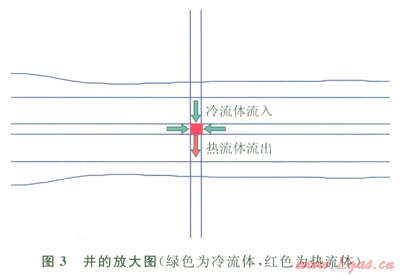式中A1表示導(dǎo)熱面積0.4m2(井左右網(wǎng)格對井導(dǎo)熱距離大,其導(dǎo)熱熱流忽略);l表示導(dǎo)熱系數(shù),其中lrock表示地層骨架(沙石)導(dǎo)熱系數(shù),3.1W/(m·K),占0.6的空間,有效導(dǎo)熱系數(shù)為1.86W/(m·K),lrock表示水的導(dǎo)熱系數(shù)0.58W/(m·K),孔隙度為0.4,飽和度為0.5,有效導(dǎo)熱系數(shù)為0.12W/(m·K);DT表示井和其周圍網(wǎng)格間溫差,來自模擬結(jié)果文件;L表示導(dǎo)熱距離0.35m,井中心到上下網(wǎng)格中心距離。