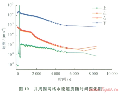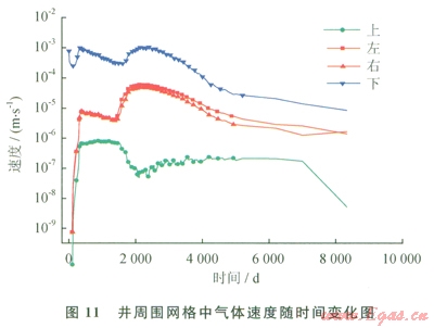孔隙滲透換熱能夠?qū)⒛芰總魅宋锊?。圖l0為井周圍網(wǎng)格水流速度隨時(shí)間的變化圖。左、右和下表示網(wǎng)格中水流向井內(nèi),而上則表示井從上流入其正下方網(wǎng)格。圖10中下表示正上方網(wǎng)格流人下方井內(nèi)水流速率,也就是圖10中“下”表示的曲線,該速率遠(yuǎn)高于其他3個(gè)方向的速率。圖ll為井周圍網(wǎng)格中氣體速率隨時(shí)間變化圖。同樣是上方網(wǎng)格流向正下方井內(nèi)氣體速率最大,也就是圖ll中“下”表示的曲線。氣流和水流的速率數(shù)量級(jí)均為l04m/s。由于甲烷氣導(dǎo)熱系數(shù)約為0.03W/(m·K),遠(yuǎn)低于液態(tài)水的導(dǎo)熱系數(shù),其換熱可以不計(jì)算,這里只計(jì)算水的對流。