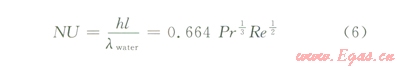 式中NU表示努賽爾數(shù);h表示換熱系數(shù);l表示特征長度0.33m,4倍面積除以潤周得到特征長度;lwater表示水的有效導(dǎo)熱系數(shù),0.12W/(m·K);Pr表示普朗特?cái)?shù),取飽和水40℃時(shí)的值;Re表示雷洛數(shù)。
