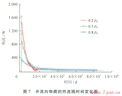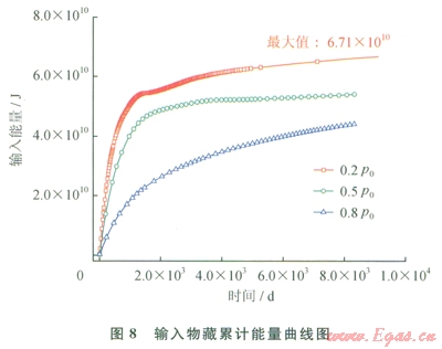 用80m×400m×1m水合物藏開采模擬所得數(shù)據(jù),結(jié)合開采物藏和井的參數(shù),可計(jì)算減壓和加熱對水合物分解的貢獻(xiàn)。水合物藏中水合物總質(zhì)量為3.6×106kg。由式(2)可得,完全通過加熱熔化需要能量1.27×1012J。圖7為井流向物藏的熱流隨時(shí)間變化圖。對圖7熱流進(jìn)行積分,得到輸入物藏累計(jì)能量變化曲線(圖8)。在0.2P0、42℃條件下,輸人物藏的能量最大,為6.71×1010J。井內(nèi)溫壓條件為0.5P0、42℃時(shí),輸入物藏的能量為5.39×1010J,0.8P0、42℃時(shí),輸人物藏能量為4.39×1010J。由式(1)可得,在0.2P、42℃條件下,加熱分解了5.28%的水合物,其余的水合物由減壓驅(qū)動(dòng)力所分解。而在另外兩種井內(nèi)溫度壓力條件下,加熱分解的水合物量多一些,而減壓所分解的水合物量相比更少一些。