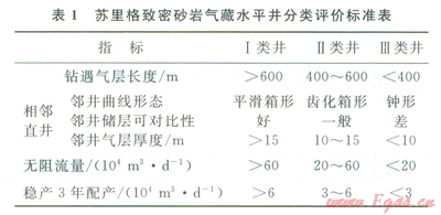 根據(jù)蘇里格致密砂巖氣藏現(xiàn)有的200多口水平井資料統(tǒng)計,水平井的試氣無阻流量主要在40×l04/m3/d以上,試氣產量主要在6×104m3/d以上。但部分井的修正等時試井數(shù)據(jù)分析Ⅲ1表明:由于測試時間較短,低滲砂巖氣藏氣井的壓力傳導范圍有限。因此,水平井試氣計算的無阻流量普遍偏高較多,與試井計算的無阻流量相比,相對誤差在15%~60%。由于通過測井等靜態(tài)資料,無法獲取水平井鉆遇有效儲層的垂向厚度參數(shù),加上試氣無阻流量的誤差較大。因此,致密氣藏水平井的分類應綜合多方面的因素。在對蘇里格氣田l90 口水平井地質分析和產能評價的基礎上(圖1),初步提出了蘇里格致密砂巖氣藏水平井的分類評價標準(表1)。