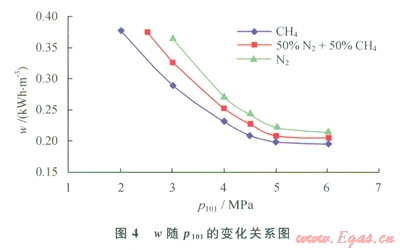 當(dāng)LNG儲(chǔ)存壓力(P104)為2MPa、氣體制冷劑膨脹前壓力(P204)為5MPa、氣體制冷劑膨脹前預(yù)冷溫度(t206)為-30℃時(shí),在一定范圍內(nèi)改變進(jìn)口天然氣壓力(P101),通過(guò)HYSYS軟件模擬計(jì)算可得到產(chǎn)品LNG的單位能耗(w),進(jìn)而得到w隨P101的變化關(guān)系(圖4)。由南圖4可知,產(chǎn)品LNG單位能耗隨進(jìn)口天然氣壓力的增加而降低。這是因?yàn)閴毫υ礁撸瑩Q熱器的平均換熱溫差越小,因而能耗越低。由于進(jìn)口天然氣壓力的升高對(duì)承壓設(shè)備的要求也增加,故而不宜太高。因此,取P101為5MPa作為最優(yōu)進(jìn)口壓力。