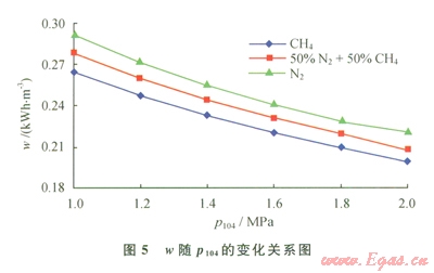 當(dāng)進(jìn)口天然氣壓力(P101)為5MPa、氣體制冷劑膨脹前壓力(P204)為5MPa、氣體制冷劑膨脹前預(yù)冷溫度(t206)為-30℃時(shí),在一定范圍內(nèi)改變LNG儲(chǔ)存壓力(P104),通過(guò)HYSYS軟件模擬計(jì)算可得到產(chǎn)品LNG的單位能耗(w),進(jìn)而得到叫隨P104的變化關(guān)系(圖5)。由圖5可知,產(chǎn)品LNG單位能耗隨LNG儲(chǔ)存壓力的增加而降低,這是因?yàn)閮?chǔ)存壓力越高,對(duì)應(yīng)的液化溫度越高,所需的制冷量越少,因而能耗越低。然而儲(chǔ)存壓力的升高對(duì)儲(chǔ)存和輸運(yùn)容器的耐壓要求也增高,增加了運(yùn)輸成本[10]。取P104為2MPa作為最優(yōu)的LNG儲(chǔ)存壓力。